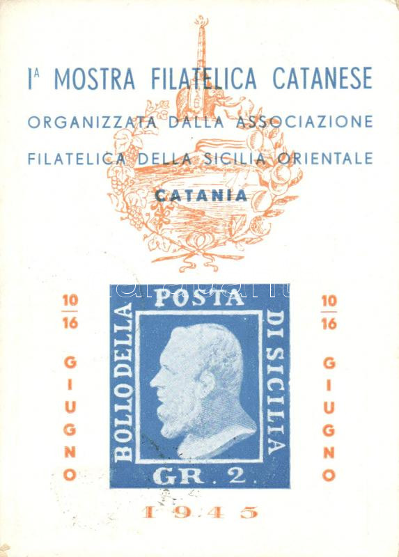 1945 Catania Philatelic exhibition, So. Stpl (EK) https://www.darabanth.com/hu/223-Gyorsarveres/223.0/Kepeslapok/Belyeg~40371/1945-Catania-Philatelic-exhibition-So-Stpl-EK~II974172