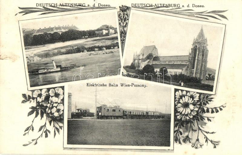 Leírás: Németóvár, Bad Deutsch-Altenburg; Elektrische Bahn Wien-Pozsony, SS Schönbrunn / train, steamship, floral
