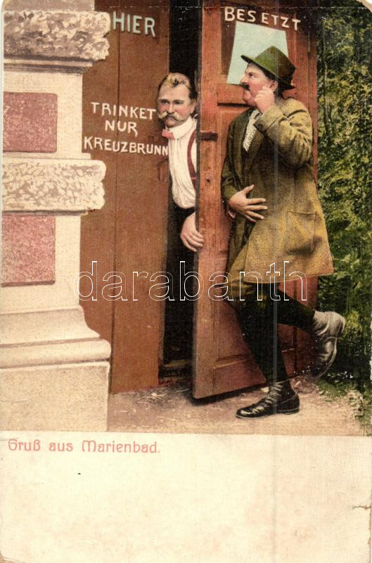 Leírás: Marianske Lazne, Marienbad; 'Trinken nur kreuzbrunn' humour, litho (small tear)