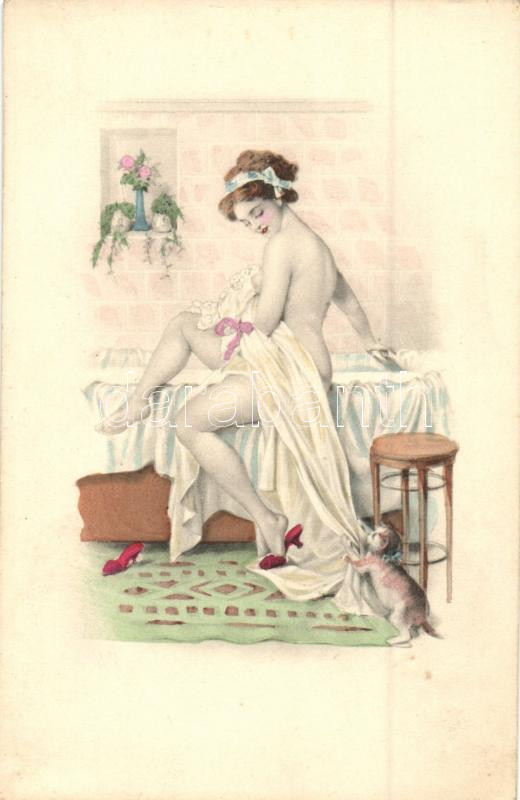 Leírás: Erotic art postcard, lady in the bathtub, cat, H & L Nr. 1681. (EK)