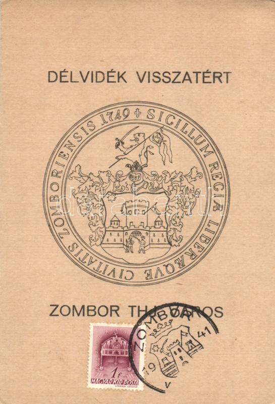 1941 Délvidék Visszatért, Zombor / Hungarian Irredenta 'vissza' So. St... https://www.darabanth.com/hu/223-Gyorsarveres/223.0/Kepeslapok/Irredenta~40386/1941-Delvidek-Visszatert-Zombor-Hungarian-Irredenta-vissza-So-Stpl-EK~II970556