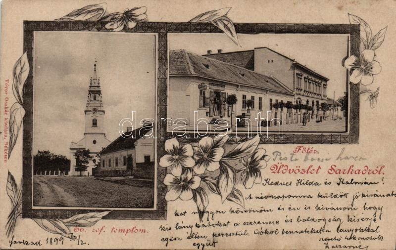 Leírás: 1899 Sarkad, Református remplom, Fő utca, Bleyer Jakab kereskedése, floral; kiadja Véver Oszkár