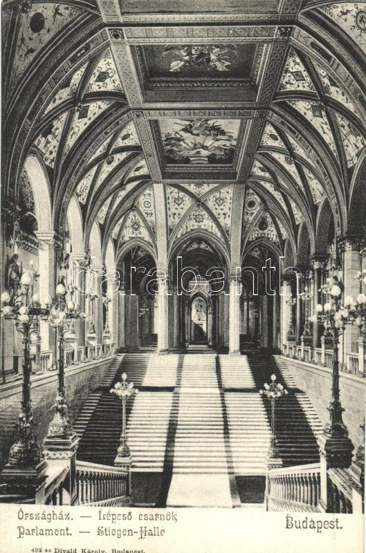 Budapest V. Országház, Lépcső csarnok, belső https://www.darabanth.com/hu/223-Gyorsarveres/223.0/Kepeslapok/Magyarorszag~20006/Budapest-V-Orszaghaz-Lepcso-csarnok-belso~II968817