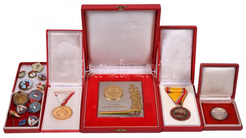14db vegyes szocialista kitüntetés, jelvény és kitűző, közte "A Haza Fegyveres Szolgálatában 10 év", "A Magyar Polgári Védelemért", "A Könnyűipar Kiváló Dolgozója" T:vegyes