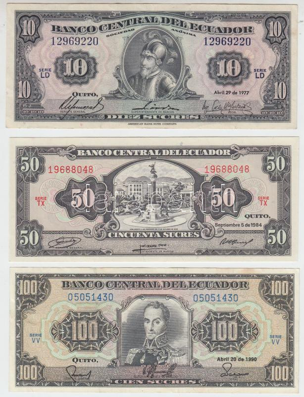 Ecuador 1977. 10 Sucres + 1984. 50 Sucres + 1990. 100 Sucres C:UNC,VF,F