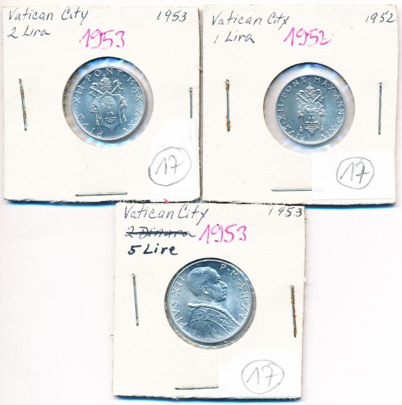 Vatican 1... https://www.darabanth.com/hu/223-Gyorsarveres/223.0/Numizmatika/Kulfoldi-fem-es-ezustpenzek~10013/Vatikan-1952-1L-Al-plus-1953-2L-Al-plus-5L-Al-XII-Pius-T1-1--3Cbr3EVatican-1952-1-Lira-Al-plus-1953-2~II972345