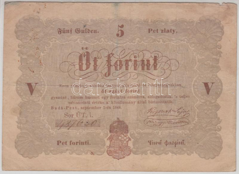 Leírás: 1848. 5Ft "Kossuth bankó" barna T:III