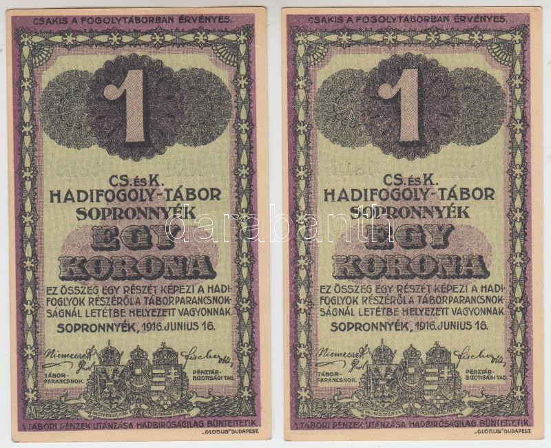 Sopronnyék / hadifogolytábor 1916.06.16. 1K római sorozatszám és arab ... https://www.darabanth.com/hu/223-Gyorsarveres/223.0/Numizmatika/Papir-es-fem-szuksegpenzek~10007/Sopronnyek-hadifogolytabor-19160616-1K-romai-sorozatszam-es-arab-sorszammal-2x-sorszam~II974049