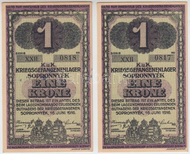 Leírás: Sopronnyék / hadifogolytábor 1916.06.16. 1K római sorozatszám és arab sorszámmal (2x) sorszámkövetők T:I-