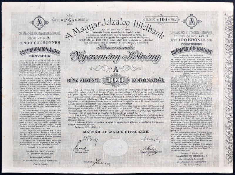 Budapest 1906. "Pesti Hazai Első Takarékpénztár-Egyesület" nyeremény-kötvénye 100K-ról, szárazpecséttel + 1906. "Magyar Jelzálog-Hitelbank Nyeremény-Kötvény" 100K-ról, 3 nyelven, szárazpecséttel T:III,II
