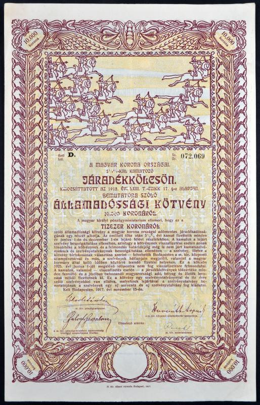 Budapest 1917. "A magyar korona országai, 5-1/2%-kal kamatozó járadékkölcsön - államadóssági kötvény" 10.000K-ról szelvényekkel, szárazpecséttel T:I- hajtatlan