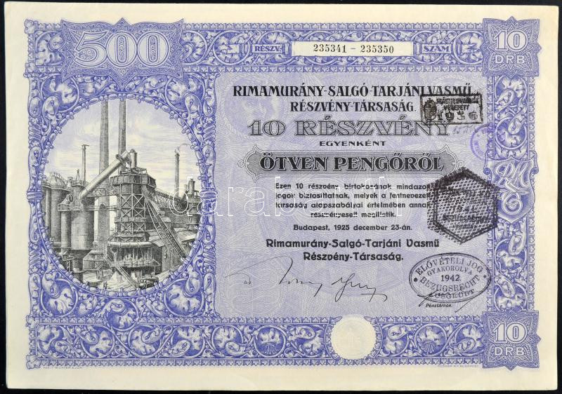 Leírás: Budapest 1925. "Rimamurány-Salgó-Tarjáni Vasmű Részvény-Társaság" 10 részvénye egyenként 50P-ről, szelvényekkel, szárazpecséttel és felülbélyegzésekkel T:I- hajtatlan