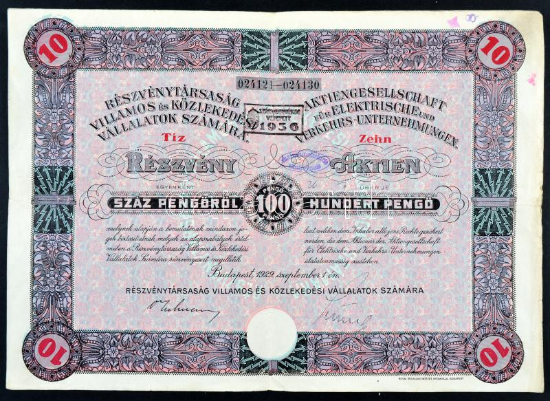 Budapest 1929. "Részvénytársaság Villamos és Közlekedési Vállalatok számára" 10 részvénye egyenként 100P-ről magyar és német nyelven, szárazpecséttel, bélyegzéssel T:III
