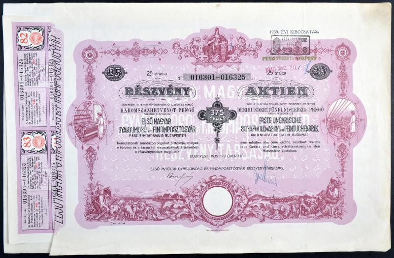 Budapest 1939. "Első Magyar Gyapjúmosó és Finomposztógyár Részvénytárs... https://www.darabanth.com/hu/223-Gyorsarveres/223.0/Numizmatika/Reszvenyek-es-sorsjegyek~10006/Budapest-1939-Elso-Magyar-Gyapjumoso-es-Finomposztogyar-Reszvenytarsasag-reszvenye-37~II967295