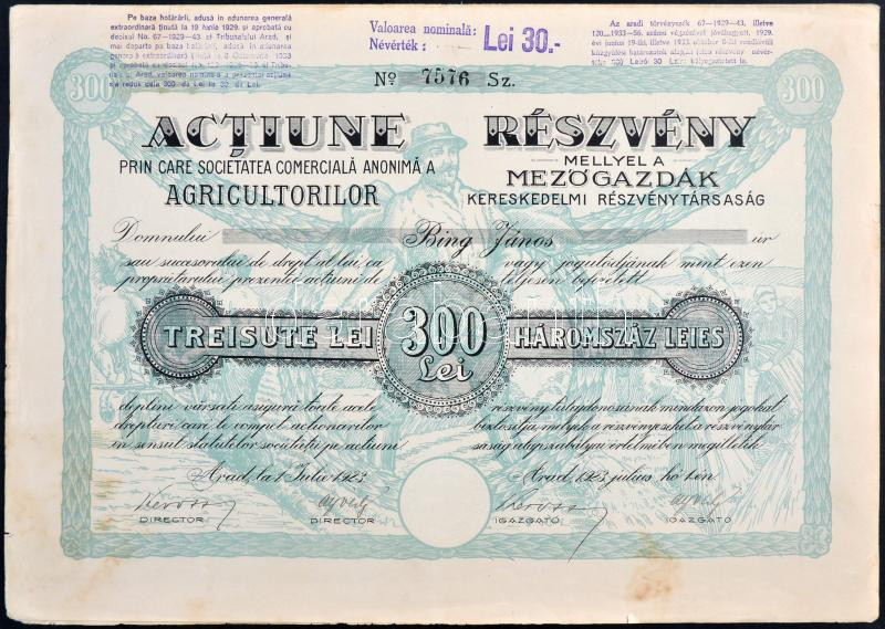 Románia / Arad 1923. "Mezőgazdák Kereskedelmi Részvénytársaság" részvénye 300L-ről szelvényekkel T:III