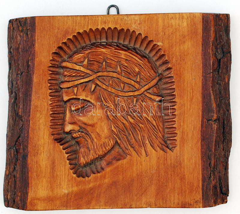Leírás: TK jelzéssel: Töviskoszorús Krisztus-fej, fa faragás, 19,5×16 cm