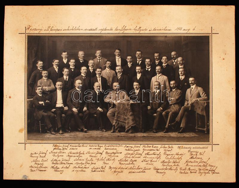 1913 augusztus 6. A pozsonyi ált. fémipari szakiskolában rendezett rajztanítói tanfolyam hallgatói és tanári kara, feliratozva, a csoportképen szereplők nevével, Mindszenty (Pozsony) fotó, 15x25 cm, karton 25x33 cm