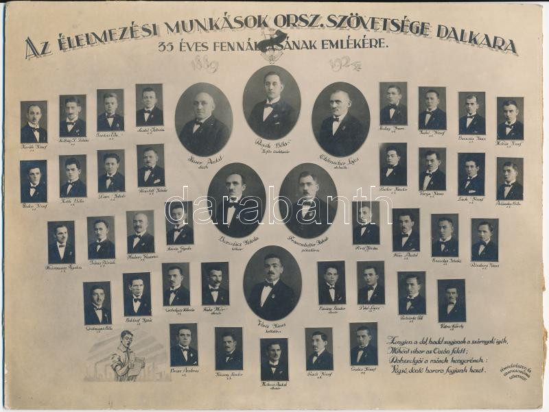 Leírás: 1924 Az Élelmezési Munkások Országos Szövetsége dalkara 35 éves fennállásának emlékére készült tabló, rajta 43 nevesített portré, 21x28 cm