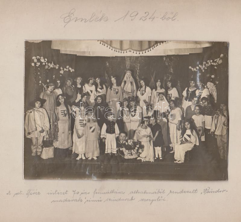 Leírás: 1924 a Szt. Teréz intézet hetvenéves fennállása alkalmából rendezett Vándormadarak c. színdarab szereplőinek csoportképe, alul feliratozva, 17×11,5 cm