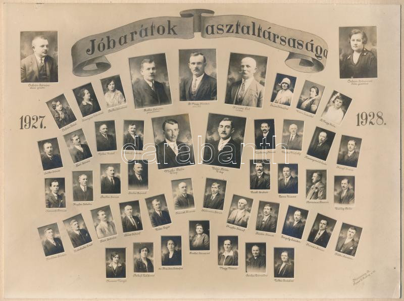 Leírás: 1928 Jóbarátok asztaltársasága, kistabló Kvassay (Bp.) műterméből, 48 nevesített portréval, 17x23 cm, karton 21x25 cm