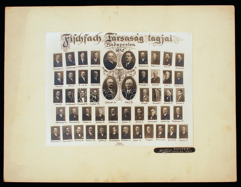 1930 A Fischfach Társaság (budapesti nyomdatulajdonosok) tagjairól készült kistabló, rajta 50 nevesített portré, Hollós műterméből, 16x21 cm, karton 25x33 cm
