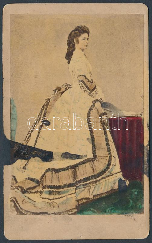 cca 1870 Wittelsbach Erzsébet, azaz Sisi (1837-1898) magyar királyné, Ferenc József felesége, vizitkártya méretű műtermi fotó, a színezésre használt retusfesték elől, hátul ráfolyt és foltot hagyott (vízben valószínűleg oldódik), keményhátú fénykép, 10x6 cm /