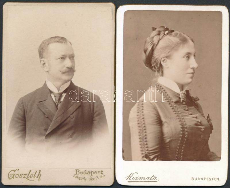 cca 1880-1900 Hazslinszky Gusztáv (1855-1918) énektanár és felesége, Hazslinszky Gusztávné szül. Csatskó Emília (?-1910) 2 db fényképe kisalakú vizitkártyán, 11×6,5 cm + Hazslinszky Gusztávné gyászjelentése