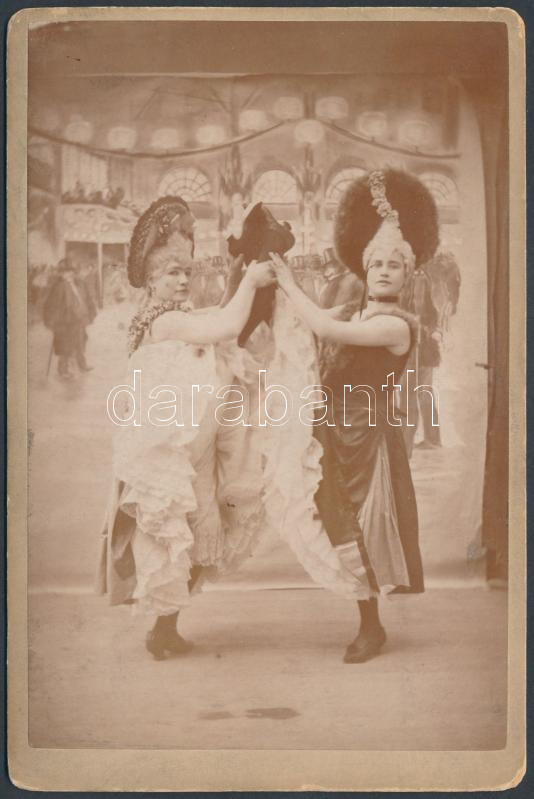 Leírás: cca 1890 J. M. Canellas (Párizs) felvétele két táncosnőről a kánkán karból, keményhátú fotó, 16x11 cm