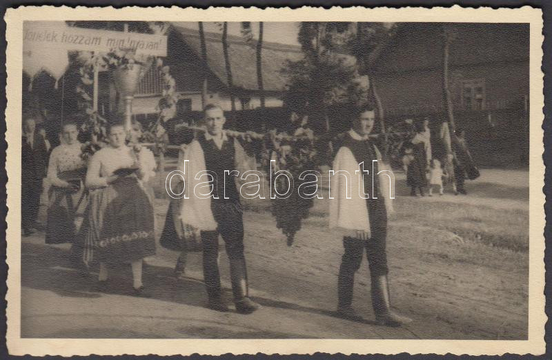 cca 1930 Tokaj, Szüreti felvonulás, fotólap, 13x9 cm https://www.darabanth.com/hu/224-Gyorsarveres/224.0/Festmeny-mutargy-papirregiseg-egyeb/Foto~33/cca-1930-Tokaj-Szureti-felvonulas-fotolap-13x9-cm~II984170