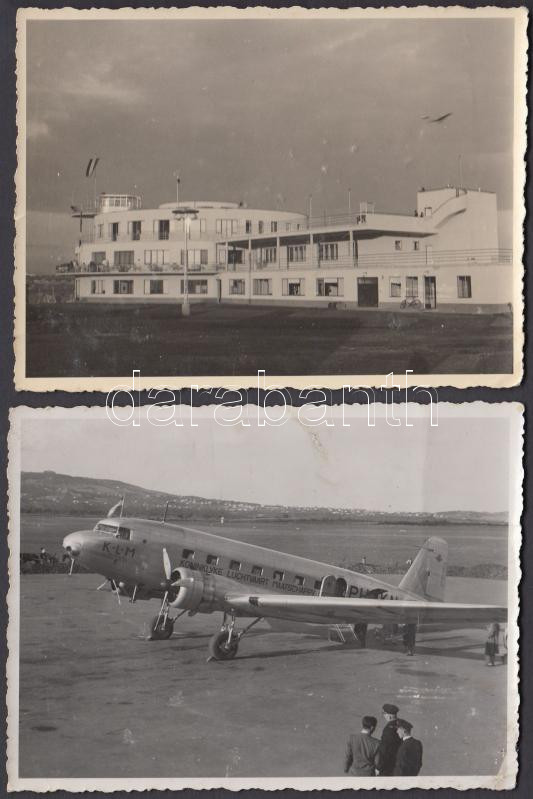 Leírás: cca 1937 A Budaörsi Repülőtér ma műemlék főépülete, K-L-M repülőgép, 2 db fotó, hátoldalon feliratozva, az egyik felületén sérüléssel, 12x9 cm
