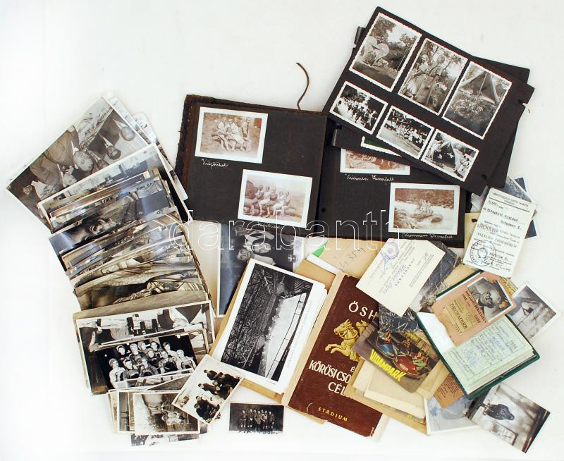 cca 1940-1960 Vegyes fotó és papírrégiség(igazolvány, reklám, stb.) tétel, családi és hivatalos rendezvények, felvonulások, néhány fotó albumlapra ragasztva, 8x6 és 17x11 cm közötti méretekben