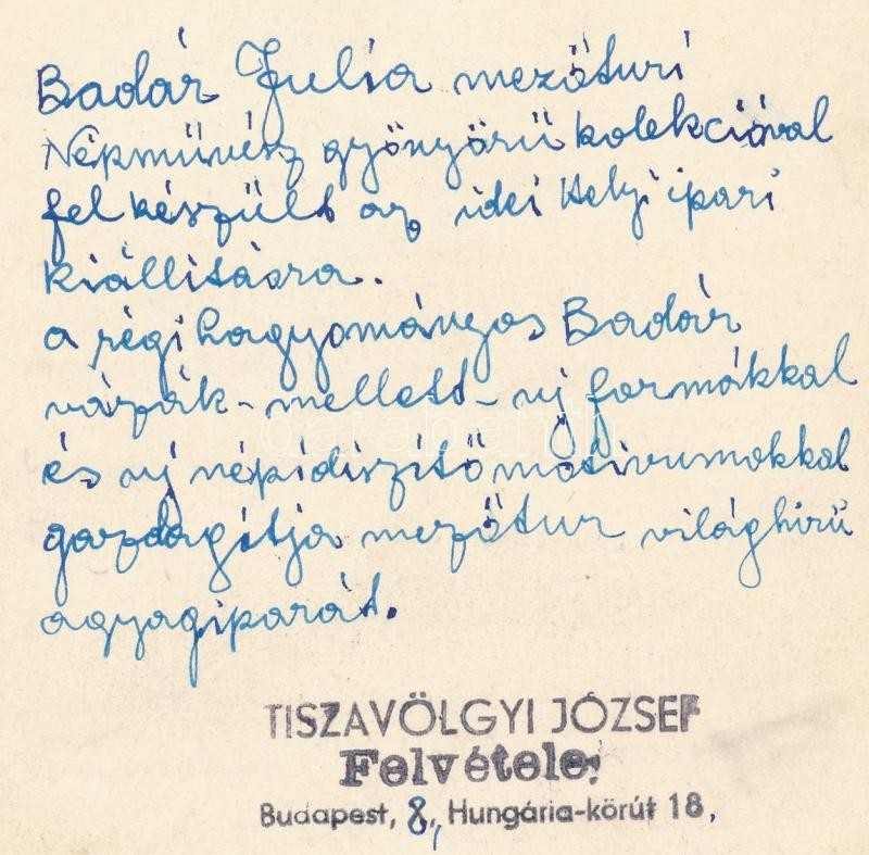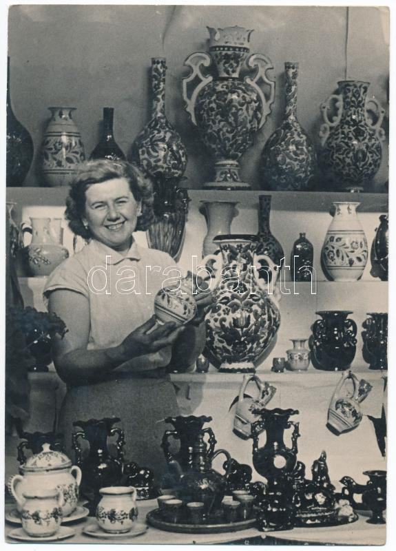 cca 1950 Badár Júlia mezőtúri népművész felkészült a fazekas család termékeivel a helyi ipari kiállításra, Tiszavölgyi József feliratozott, pecséttel jelzett riportképe, 16x11 cm