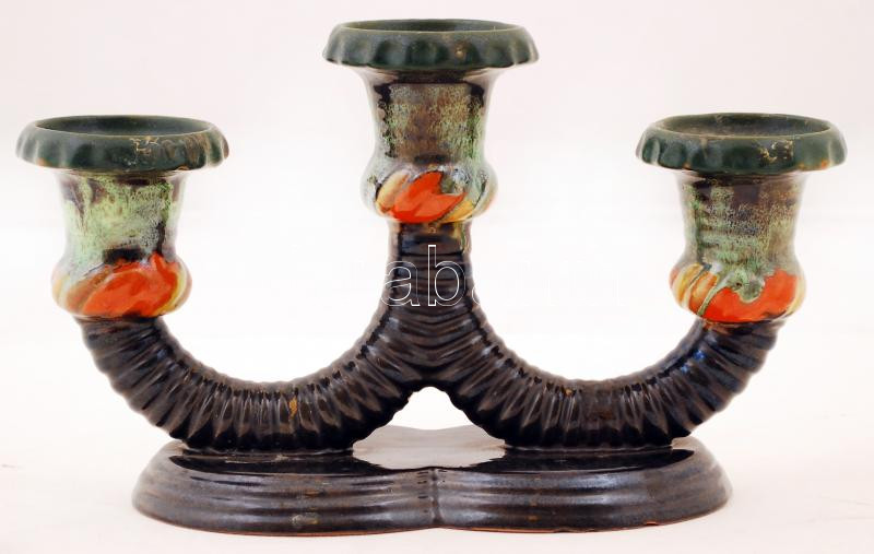 Leírás: Három ágú gyertyatartó, mázas kerámia, jelzés nélkül, apró lepattanásokkal, m:15 cm