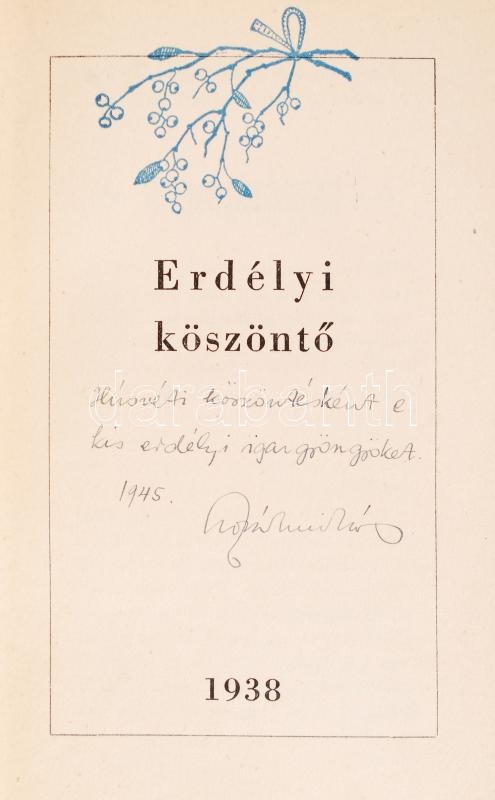 Erdélyi köszöntő. [Bp.], 1938, Révai. Nyirő József, Makkai SÁndor, Tamási Áron, Dsida Jenő és mások írásaival. Bibliofil kiadás, 2486. sorszámozott példány. Kiadói halinakötésben, jó állapotban.