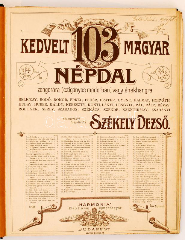 Székely Dezső (szerk.): Kedvelt 103 Magyar Népdal zongorára (czigányos modorban) vagy énekhangra. Budapest, cca 1904. Félvászon kötésben, korának megfelelő állapotban.