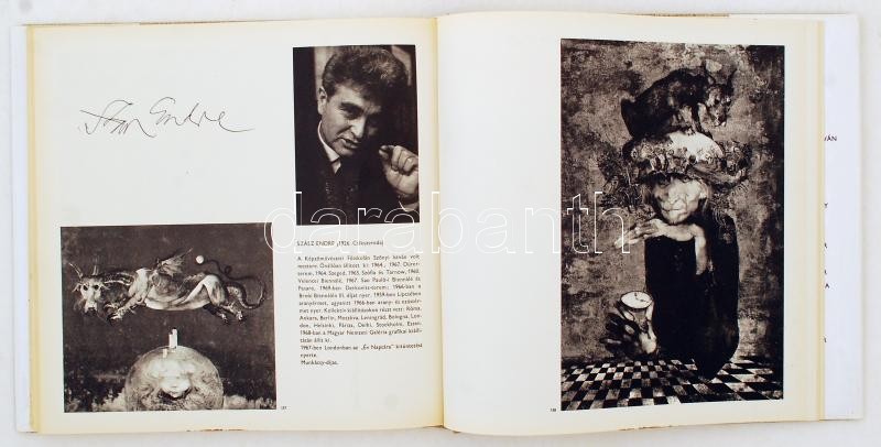 Solymár István: Mai magyar rajzművészet. Budapest, 1972, Képzőművészeti Alap Kiadóvállalat. Gazdagon illusztrált kiadvány. Több művész által dedikált példány: Barczi Pál, Feledy Gyula, Kass János, Pető János, Szász Endre. Kiadói egészvászon kötésben, fedőborítóval, dobozzal. Lapszélek alul foltosak, egyébként jó állapotú.
