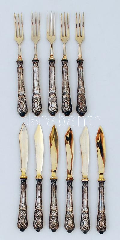 Ezüst(Ag) nyelű süteményes szett, 5 db villa, 6 db kés, jelzett, br: 3... https://www.darabanth.com/hu/224-Gyorsarveres/224.0/Festmeny-mutargy-papirregiseg-egyeb/Nemesfem-Disztargyak-Orak-es-Ekszerek~38/EzustAg-nyelu-sutemenyes-szett-5-db-villa-6-db-kes-jelzett-br-318-g~II985502