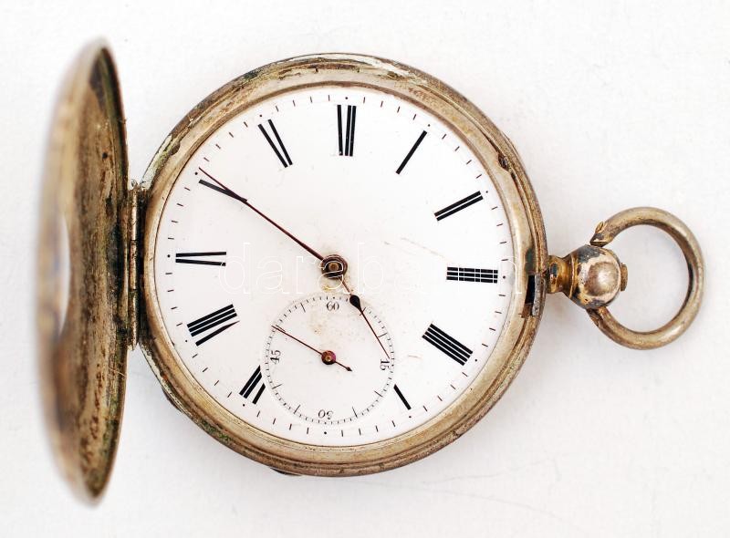cca 1880 Ancre Ligne Droite kulcsos, duplafedeles ezüst zsebóra, szép állapotban, de üveg nélkül, Külső órafedelén is számlapjelzéssel, mely zárt állapotban is mutatja az időt /