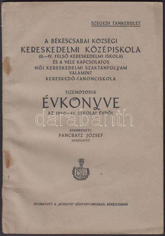 1940-1941 A Békéscsabai Községi Kereskedelmi Középiskola(II-IV. felső kereskedelmi iskola) és a vele kapcsolatos női kereskedelmi szaktanfolyam valamint kereskedő-tanonciskola évkönyve, szerkeszti: Pancratz József, 73p