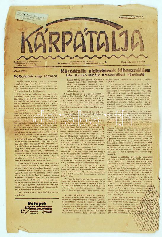 1942 Beregszász, A Kárpátalja című újság május 3-i száma https://www.darabanth.com/hu/224-Gyorsarveres/224.0/Festmeny-mutargy-papirregiseg-egyeb/Nyomtatvanyok~6/1942-Beregszasz-A-Karpatalja-cimu-ujsag-majus-3-i-szama~II984696