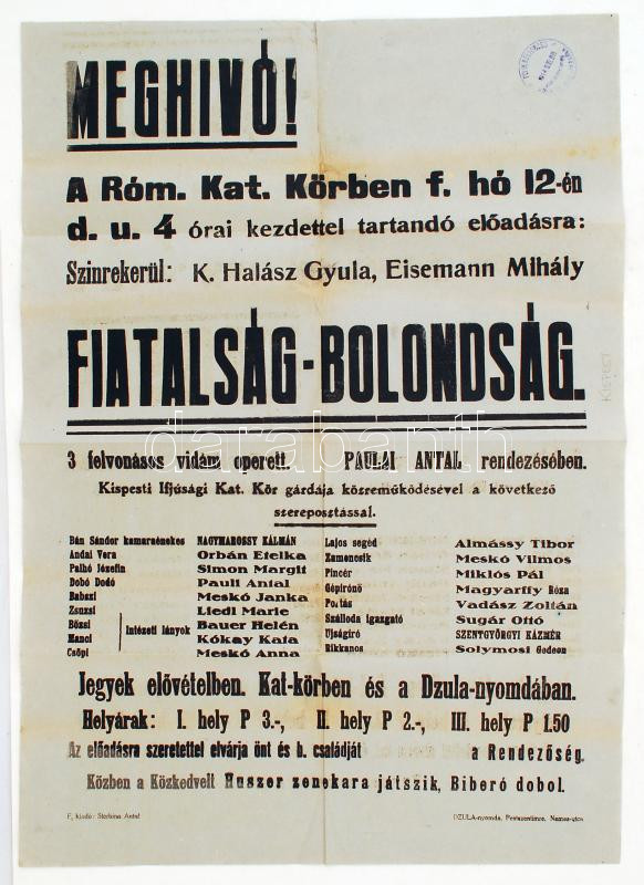 Leírás: 1944 A Kispesti Ifjúsági Katolikus Kör meghívója a Fiatalság-Bolondság című előadásukra, 42x60 cm
