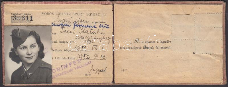 1952 A Vörös Meteor Sport Egyesület fényképes igazolványa tagdíjbélyegekkel