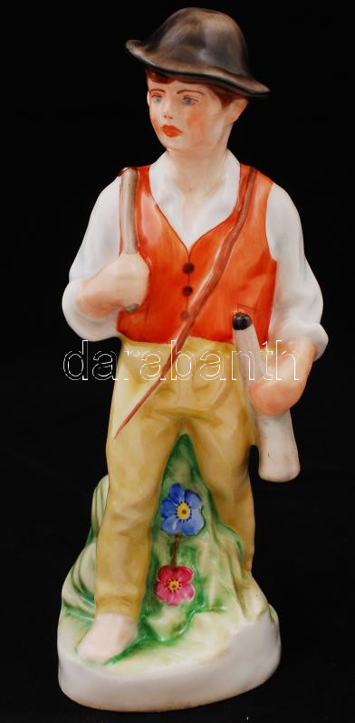 Leírás: Budapest porcelán ostoros fiú, kézzel festett, jelzett, apró kopásnyomokkal, m: 20 cm