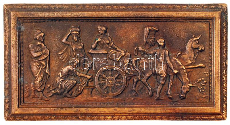 Leírás: Ókori életképet bemutató bronz plakett, jelzés nélkül, 10×19 cm