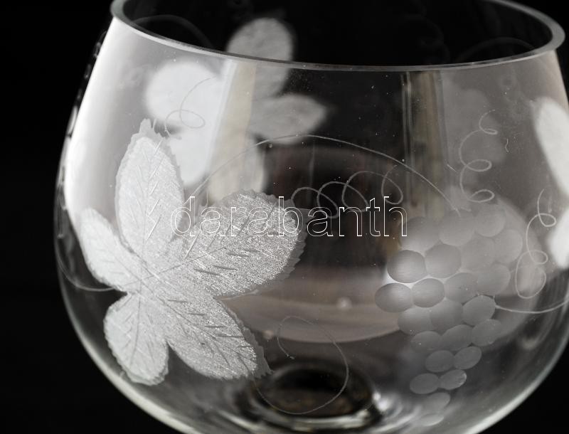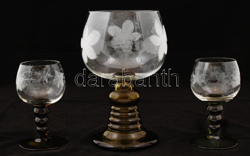 Leírás: 3 db szüreti díszítésű csiszolt üvegpohár, színezett talppal, 2 db kicsi: d: 6 cm, m: 14 cm; és 1 db nagy: d: 11 cm, m: 22 cm