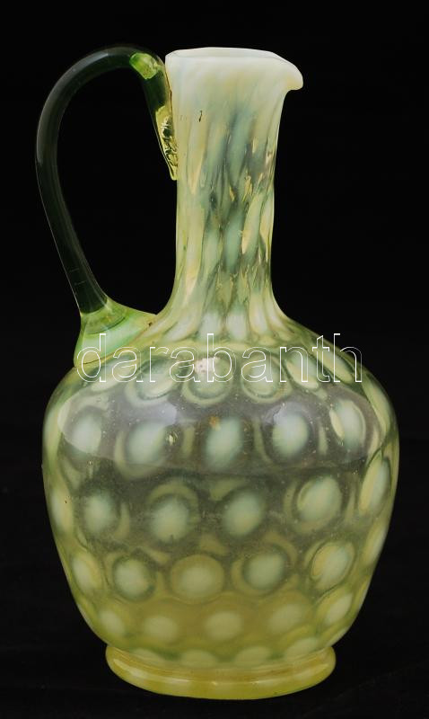Leírás: Antik szakított sárga üvegkancsó hólyagos díszítéssel, m: 16 cm