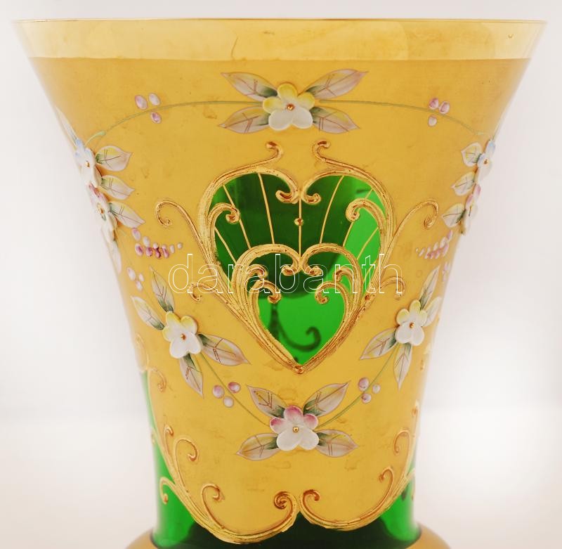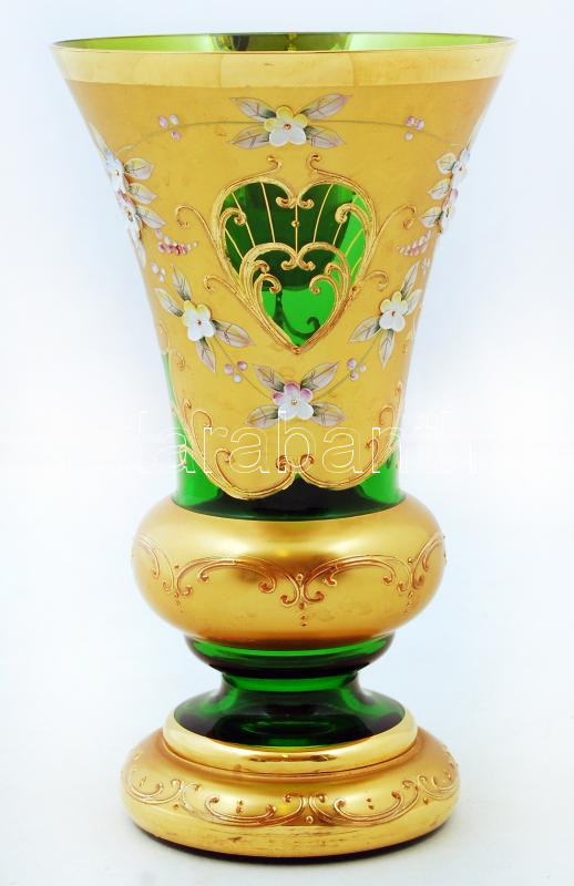 Leírás: Aranyozott, virágmintás csehszlovák színezett üveg váza, jelzés nélkül, hibátlan, d: 15 cm, m: 25,5 cm