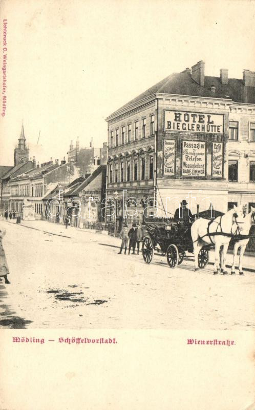 Leírás: Mödling, Schöffervorstadt, Wienerstrasse, Hotel Boeclerhütte, Restauration Garten / street, hotel, restaurant (EK)