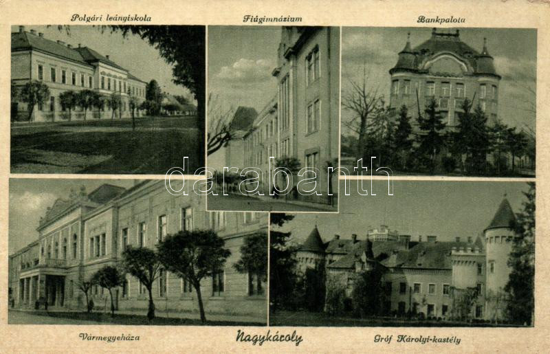 Nagykároly, Polgári leányiskola, Fiúgimnázium, Bankpalota, vármegyeház... https://www.darabanth.com/hu/224-Gyorsarveres/224.0/Kepeslapok/Erdely~10007/Nagykaroly-Polgari-leanyiskola-Fiugimnazium-Bankpalota-varmegyehaza-Grof-Karolyi-kastC3~II978192