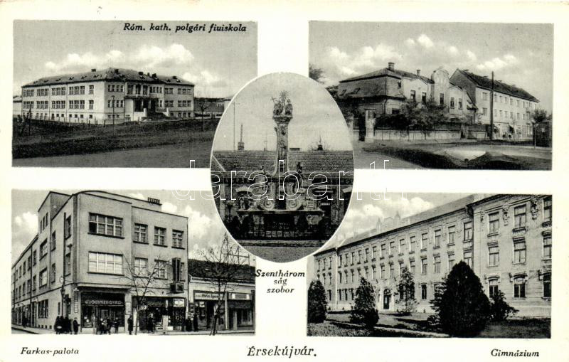 Érsekújvár, Római katolikus polgári fiúiskola, Szentháromság szobor, Farkas palota, Gimnázium / Roman catholic church, boy school, statue, secondary school
